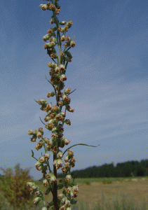 Der Gemeine Beifuß ist übersät mit vielen kugeligen Blütenständen, die nur wenige Millimeter dick sind (s. Abb. 2 und 3). Diese Pflanze gehört zu den wenigen Korbblütlern, die ihre Pollen nicht (nur) von Insekten, sondern in erster Linie vom Wind verbreiten lassen, also windblütig sind.Beifußpollen gelten als extrem aggressive Vertreter der Kräuterpollen, sie sind etwa viermal so antigenpotent wie Gräserpollen und werden nur noch getoppt von den Pollen eines verwandten Korbblütlers, des Traubenkrauts (Ambrosia), welches meist erst im September blüht. Abseits der Bestände ist die Konzentrationen an Beifußpollen in der Luft nicht hoch, aber häufig schon symptomauslösend. Beifußpollenallergiker entwickeln besonders häufig asthmatische Beschwerden. Jeder vierte Pollinotiker reagiert im Test auf Beifußpollen - und dann meist auch auf Gräserpollen. Die Hälfte der Beifußpollinotiker reagiert auch auf Ambrosiapollen, ein Drittel auf Birkenpollen. Die Flugsaison der Beifußpollen konzentriert sich auf die letzte Julidekade und die beiden ersten Augustdekaden.