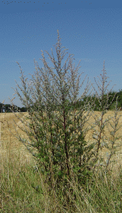 Abb.1 Staude des Gemeinen Beifußes am Rand eines abgemähten Wintergerste-Felds; sie ist über 1 m hoch und kurz vor dem Erblühen (aufgenommen in der Gemeinde 27777 Ganderkesee am 17. Juli 2006 )