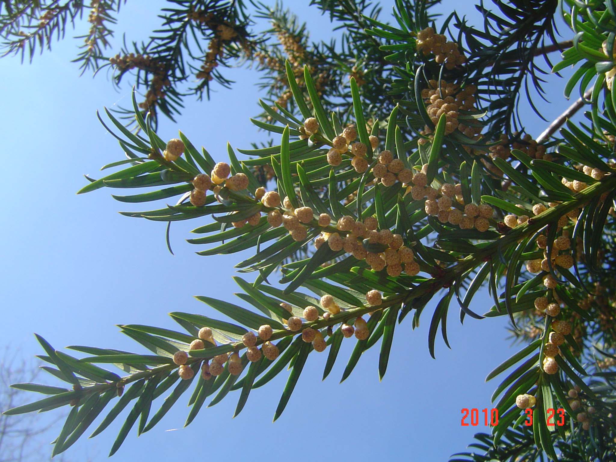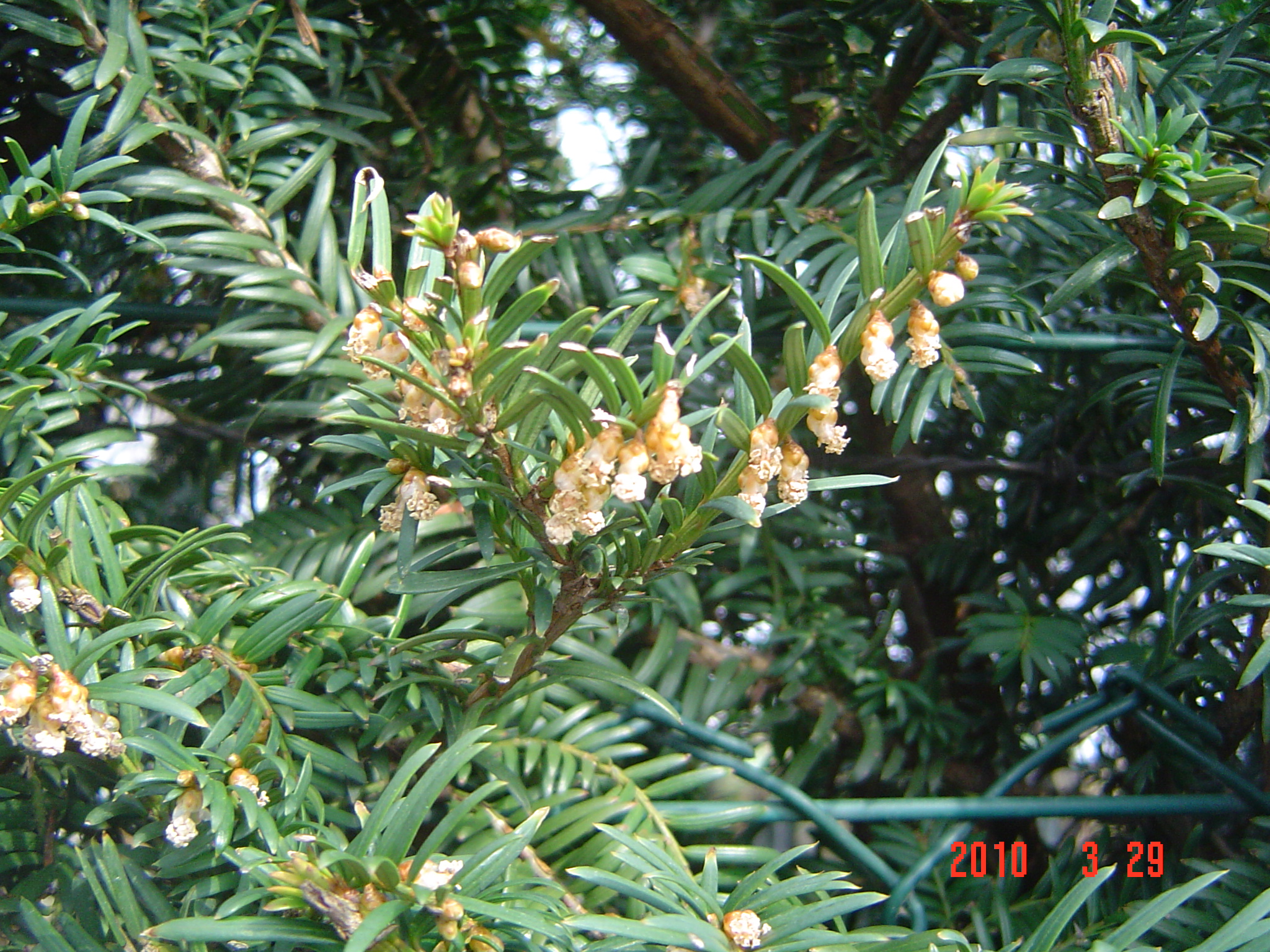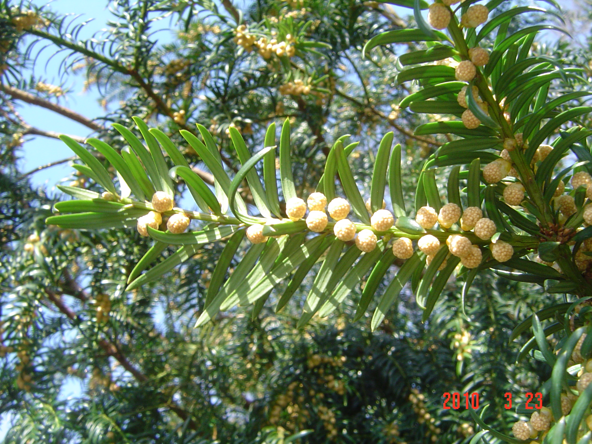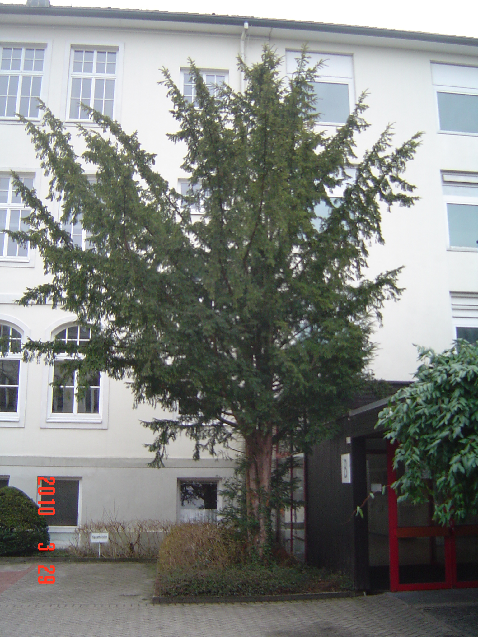 Bild 1: alte Eibe am Gymnasium an der Willmsstr. in Delmenhorst Eiben sind zweihäusig, d.h. es gibt weibliche und männliche Pflanzen. Die weiblichen Eiben fallen im Herbst durch ihre kirschkerngroßen roten Früchte auf. Ihr fleischiger Samenmantel ist der einzige essbare bzw. ungiftige Teil der Pflanze. Die männlichen Pflanzen sind im Frühjahr mit ca. 3-4mm großen kugeligen Zapfen übersät, die nach Öffnung der darin angeordneten Blüten Unmengen an Pollen freigeben.