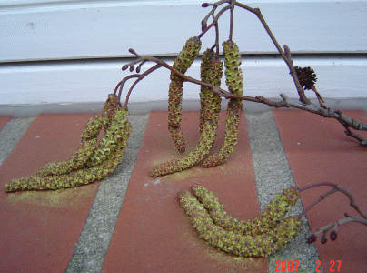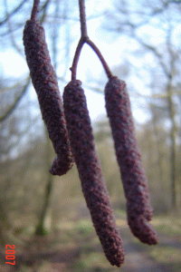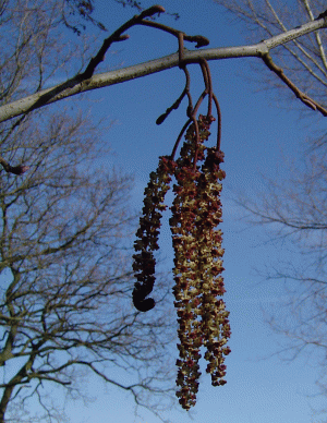 Dort wo es keine Purpur-Erle gibt, beginnt die Blüte / das Stäuben von Erle und Hasel m.o.w. gleichzeitig. In Weser-Ems, wo die Schwarz-Erle dominiert, öffnet die Hasel i.d.R. als erste ihre Kätzchen.