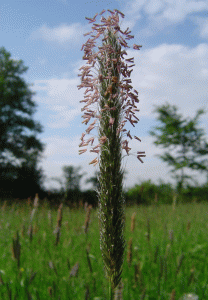 Art: Wiesen-Fuchsschwanz(gras) (Alopecurus pratensis) Es ist vor allem der brusthohe Wiesen-Fuchsschwanz, welcher - zunächst an den Rändern von Feldwegen, dann auf Wiesen - auf die beginnende Blütezeit der Gräser aufmerksam macht. Seine Blüte läutet die Leidenszeit der zahlreichen klassischen "Heuschnüpfler" ein.