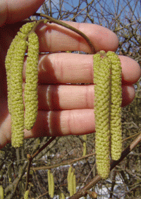 Geöffnete, lockere und stäubbereite Hasel- Kätzchen . . . . . . .